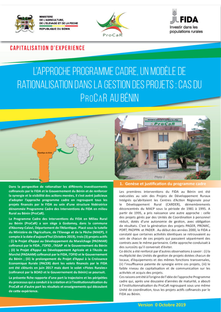 Vendredi 18 octobre 2019 l étape Terrain de la mission conjointe FIDA Gouvernement du Bénin est bouclé. Plusieurs sites maraîchers et des partenaires sont visités à Ouidah, Grand Popo, Come, Djidja, Zagnanando , calavi, et Sème. On retiendra que le PADMAR tout doucement en attendant la réalisation des grands aménagements impacte ses cibles de façon remarquable par la réalisation des planches surélevée, l appui conseil à travers les TSM, les ATDA et DDAEP, la réalisation de plusieurs puits Tubés en zones peu profonde, etc. ProCaR 16h30 les deux équipes de terrain procèdent à la synthèse des constats du terrain. Tout se déroule en présence de Mr Jean Pascal KABORE directeur pays FIDA pour le Bénin, la représentante du FIDA au Bénin madame Abelle DOSSOU HOUESSOU et Mr Sikirou OLOULOTAN Coordonnateur PROCAR.